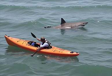A dramatic scene captures the moment a shark flips a kayak, sending the paddler into the ocean.